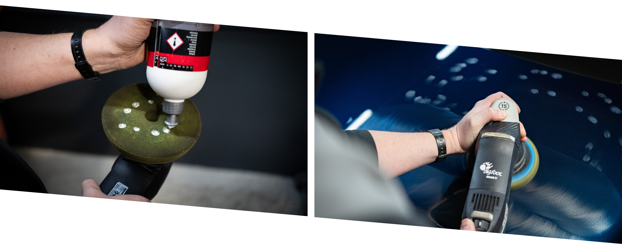 - Een polijstmachine in combinatie met speciale polijstpasta wordt gebruikt om de lak te egaliseren en kleine krasjes te verwijderen.